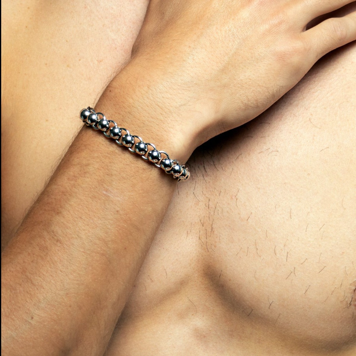 The Blair bracelet is made of stainless steel rings and beads, resistant to water, perfume and hypoallergenic. It is designed and handmade in Belgium.