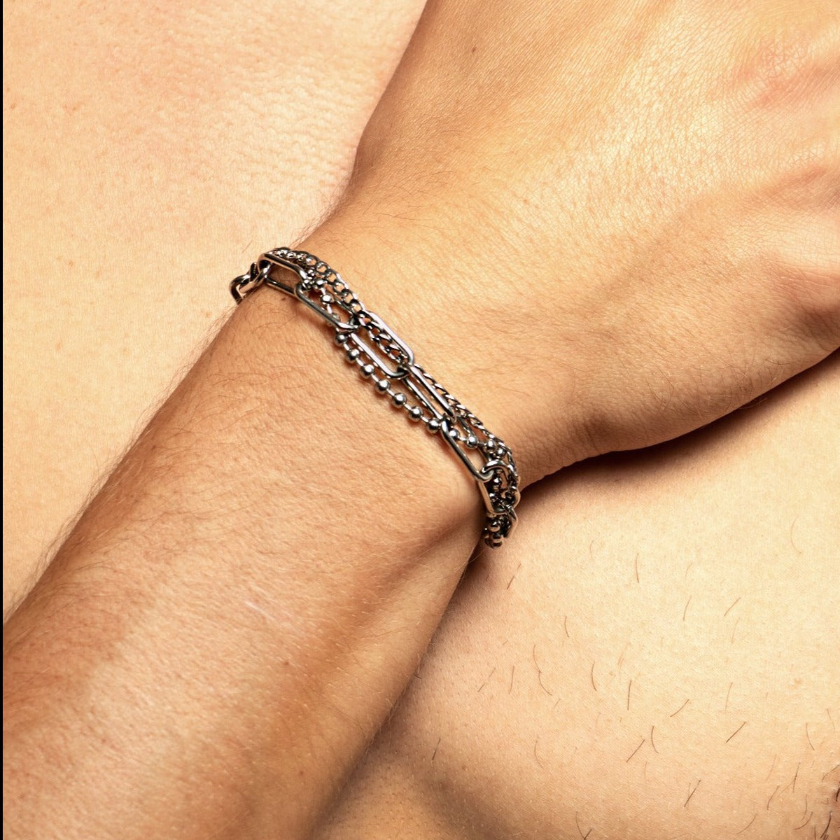 The Troy bracelet is made of 3 stainless steel chains, water resistant, perfume resistant and hypoallergenic. It is designed and handmade in Belgium.
